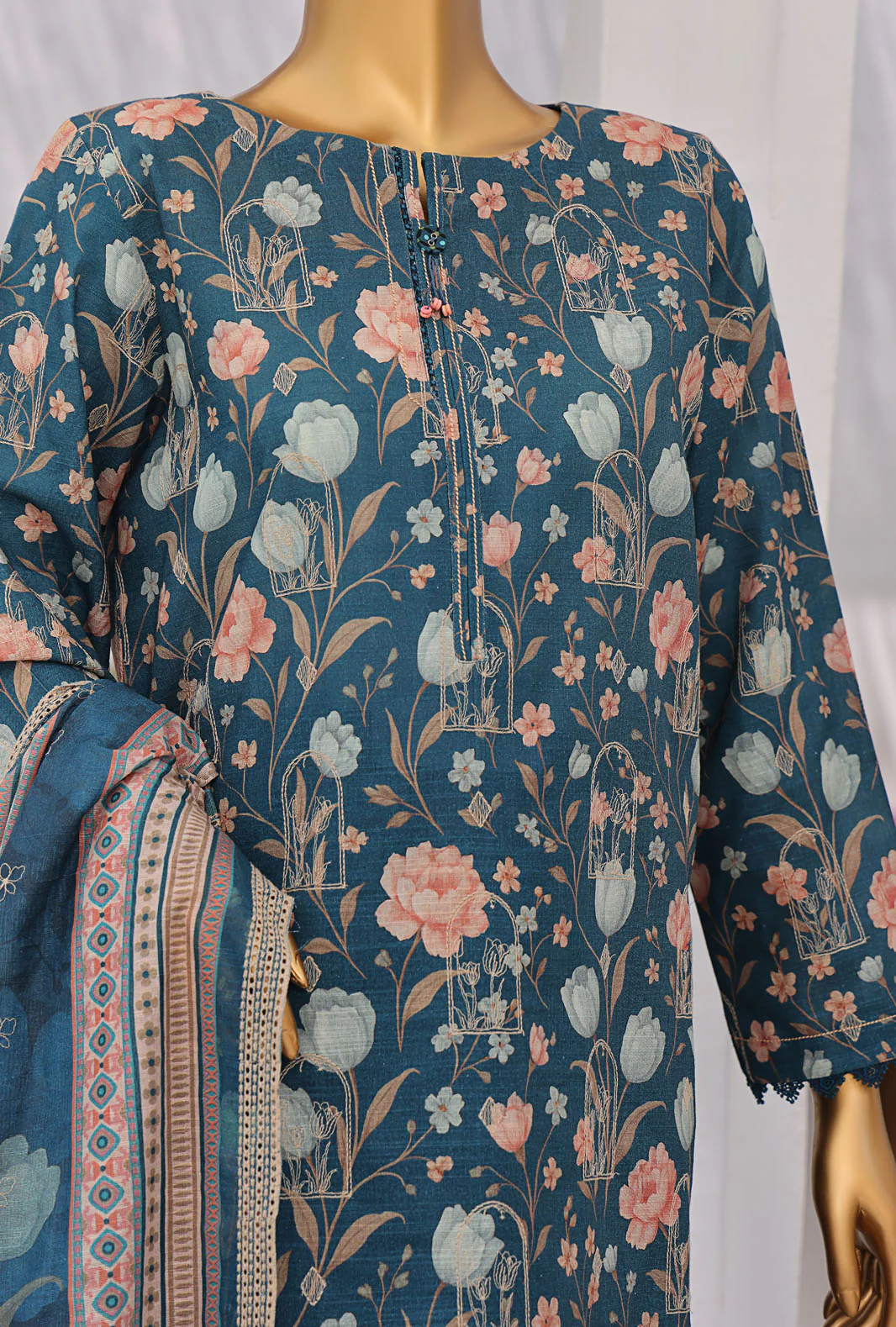 Dupatta: Premium Digital Printed & Thread Embroidered Khaddar.