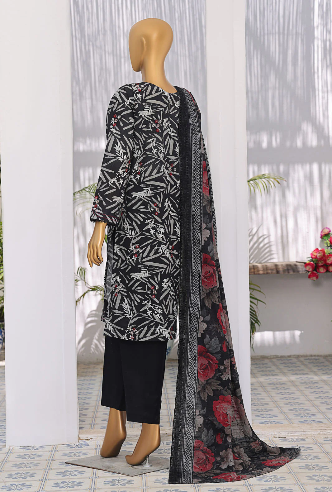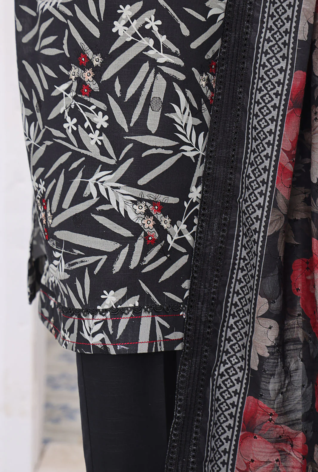 Dupatta: Premium Digital Printed & Thread Embroidered Khaddar.