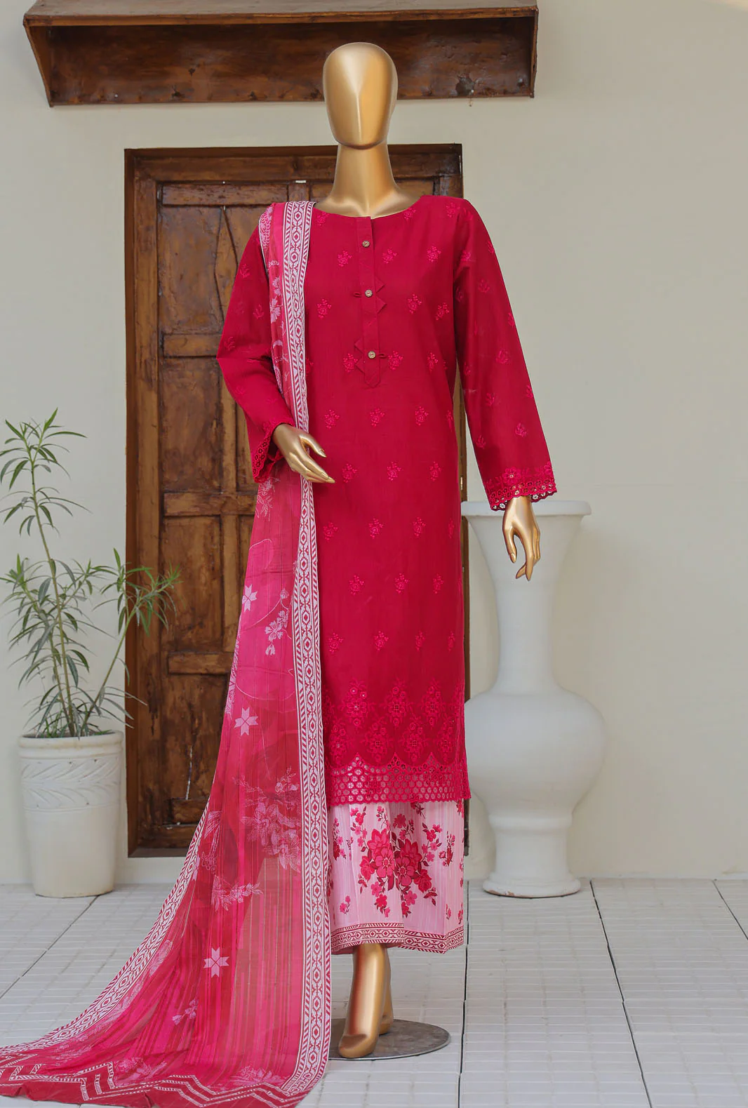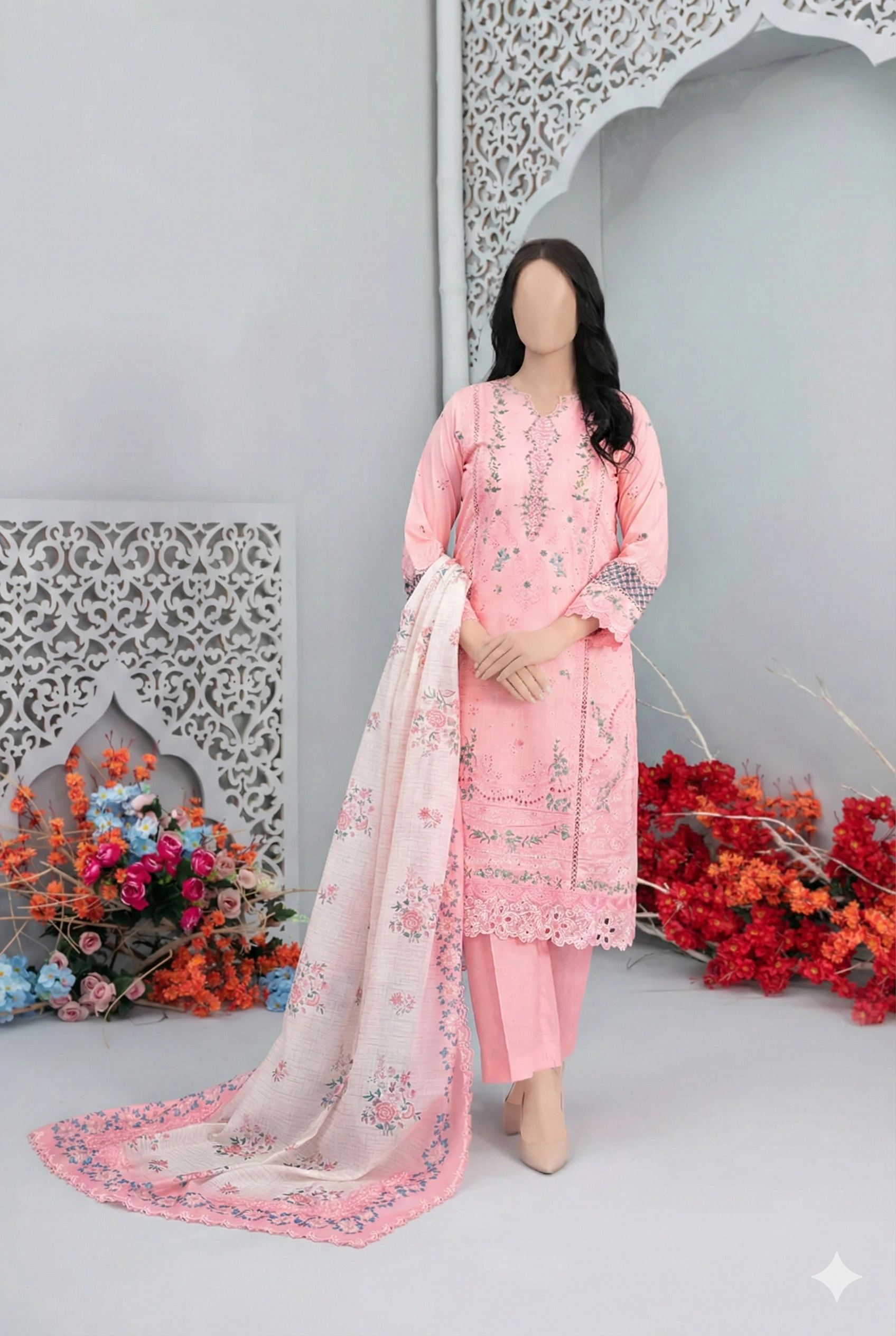 Discover the ideal harmony of ease and sophistication with our pure lawn fabric, highlighted by a digitally printed Linokara embroidered cutwork lawn dupatta to infuse your closet with vibrant grace.