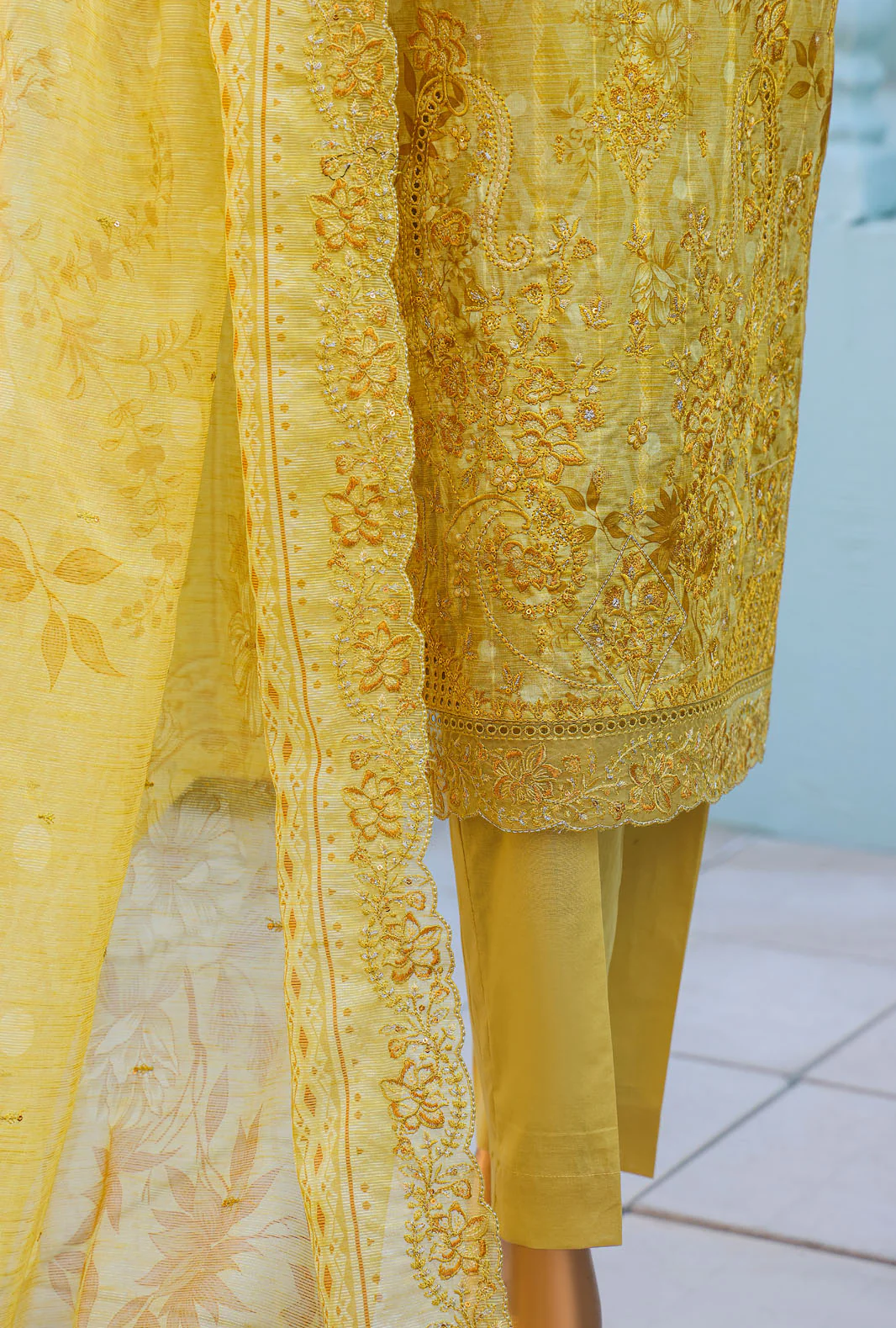Discover the ideal fusion of elegance and comfort with our premium Jacquard ensemble, paired with a digitally printed cutwork embroidered dupatta that brings a vibrant charm to your wardrobe.